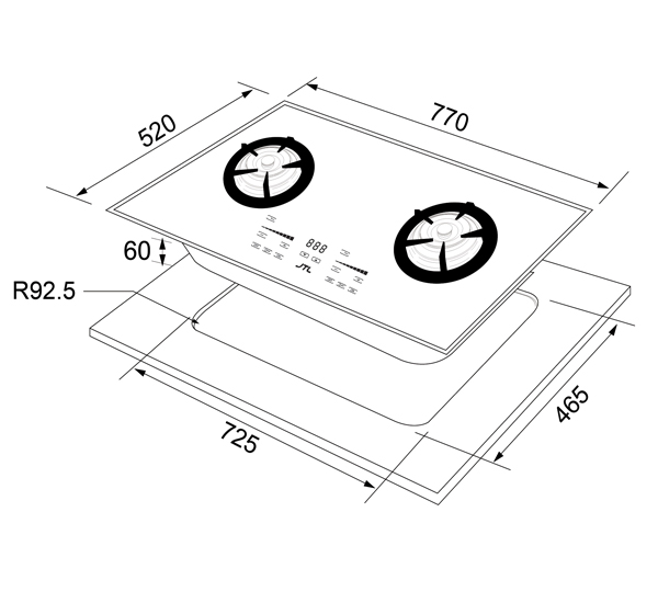 Kích thước khoét lỗ(WxD/R)mm : 725x465/92.5