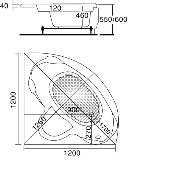 Bồn tắm Euroca EU4-1200 có kích thước 1200mm x 1200mm x 460mm, có bản vẽ kĩ thuật như sau: