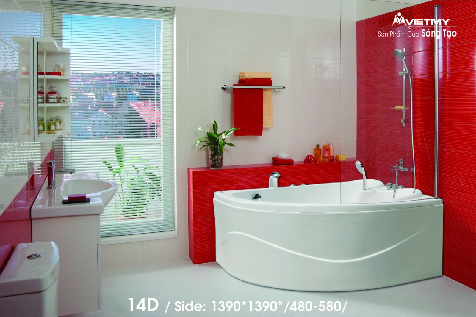 - Bồn tắm góc Việt Mỹ 14D sử dụng kiến trúc và phong cách trang trí truyền thống để mang đến những trải nghiệm hưởng thụ, thư giãn với nhịp độ chậm hơn trong phòng tắm, bạn có thể nằm trong bồn tắm hàng giờ để hưởng thụ và thư giãn.