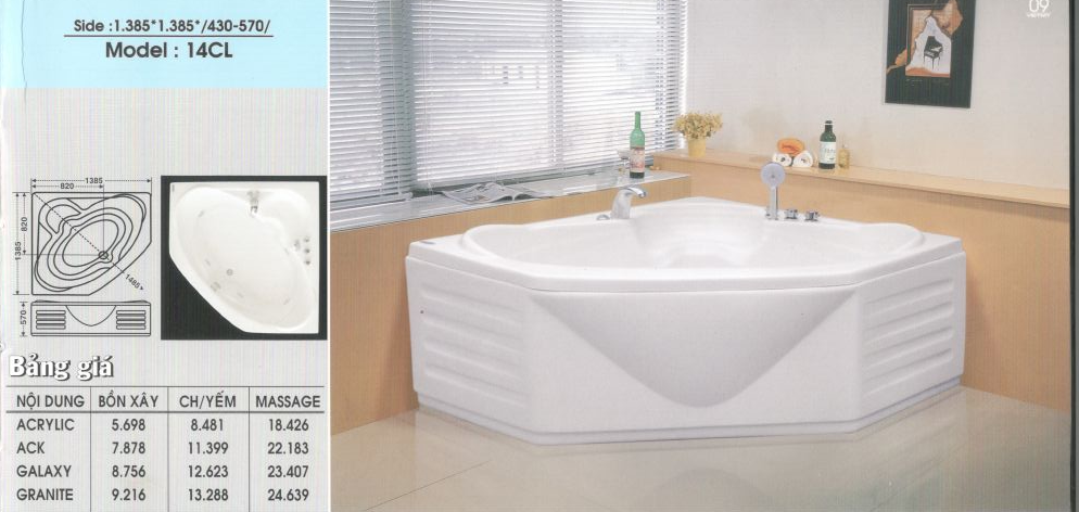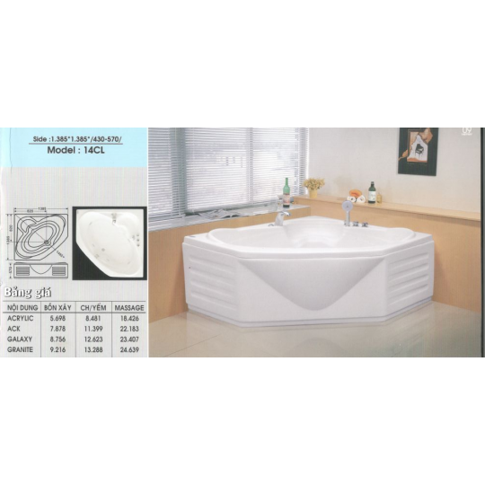 - Bồn tắm góc cao cấp Việt Mỹ 14CL là loại bồn tắm được thiết kế nhằm tận dụng tối đa không gian còn thừa của phòng tắm. Có thể là những góc mà bạn không thể được thiết bị vệ sinh nào khác nó vẫn có tác dụng với bồn tắm góc. Sử dụng bồn tắm cao cấp tạo nên nét sang trọng thoải mái cho người dùng mà tận dụng tối đa không gian phòng tắm mà vẫn toát lên được những nét sang trọng lịch lãm.