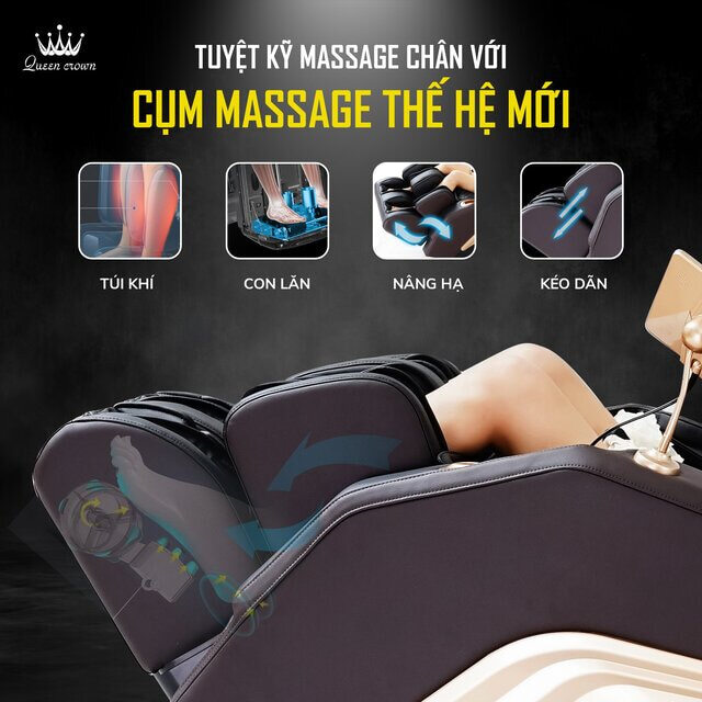 Queen Crown QC A9 Sport chiều lòng tất cả “thượng đế” của mình bằng cách chăm sóc tỉ mỉ đôi chân ngọc ngà - trái tim thứ hai của cơ thể. Ghế được trang bị cụm massage chân thế hệ mới với khả năng xoa bóp, ấn huyệt, day miết từ ngón chân cho tới gót chân. Đặc biệt cụm massage còn được trang bị bi bóp gót chân giúp xua đi cơn đau gót chân nhanh chóng cho các chị em thường xuyên đi giày cao gót.