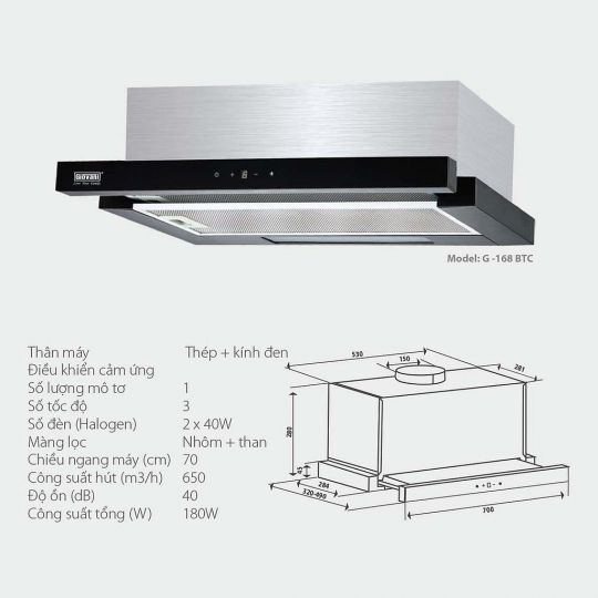 Máy hút mùi Giovani G-168 BTC kiểu dáng âm tủ - kéo rút, thiết kế nhỏ gọn giúp mang lại sự gọn gàng cũng như tính thẩm mỹ cao cho căn bếp nhà bạn. Máy hút mùi Giovani G-168 BTC được sản xuất theo công nghệ Châu Âu, thương hiệu Giovani là thương hiệu nổi tiếng chuyên sản xuất các thiết bị nhà bếp được nhiều người Việt Nam tin dùng.