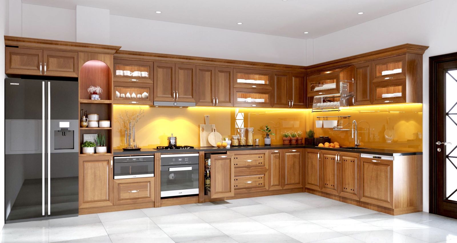 Mẫu tủ bếp cao cấp gỗ xoan đào chữ L sang trọng