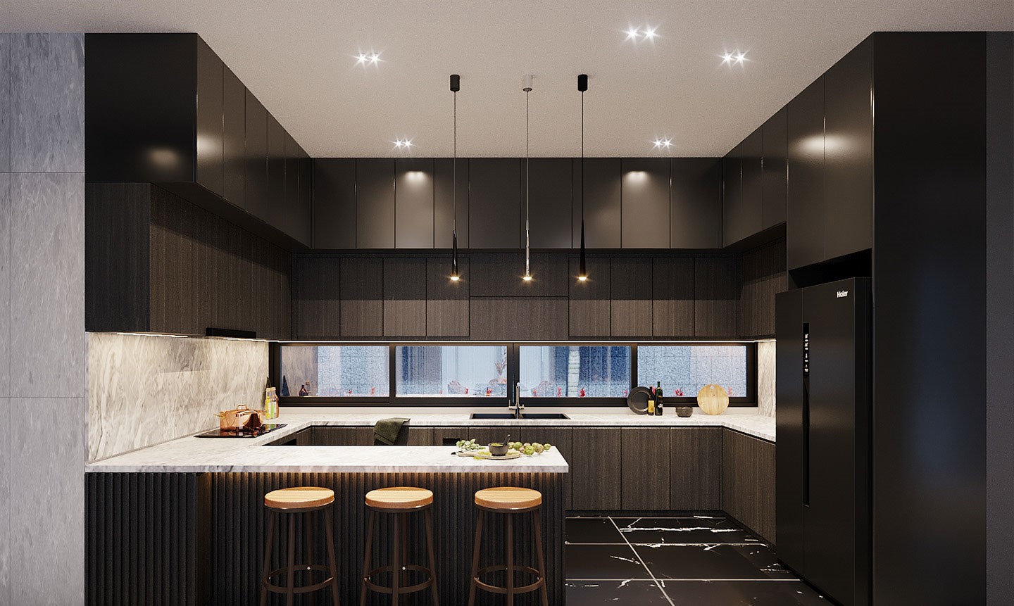 Hình mẫu tủ bếp gỗ sơn màu đen có quầy bar