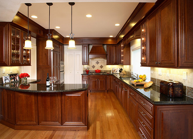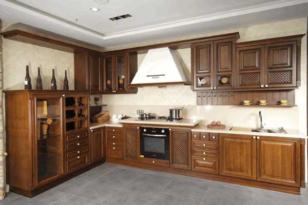 Mẫu tủ bếp biệt thự gỗ hương chữ L đơn giản