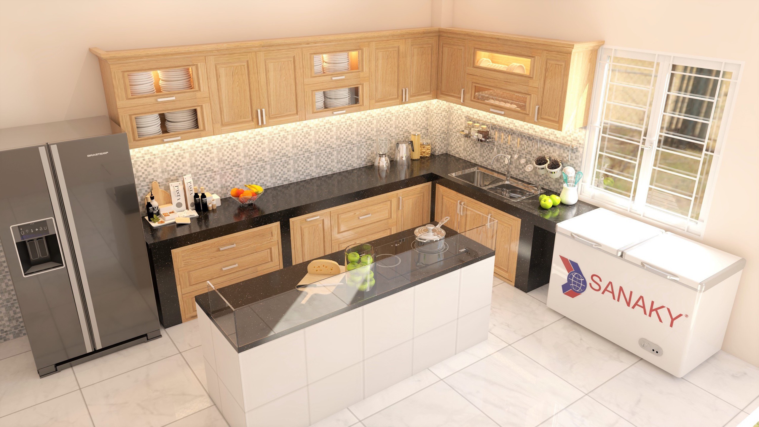 - Tủ bếp gỗ sồi mỹ có bàn đảo